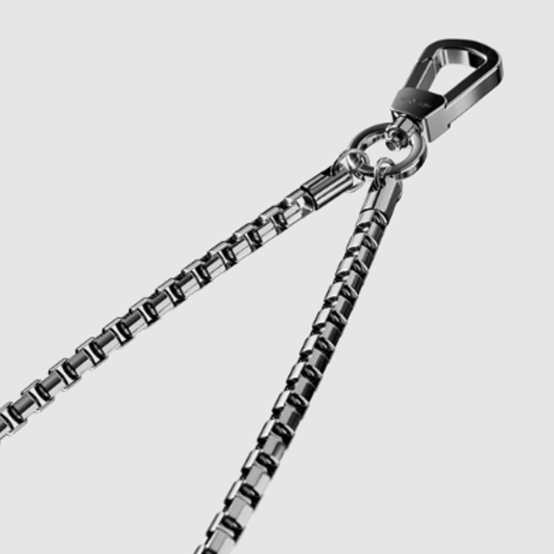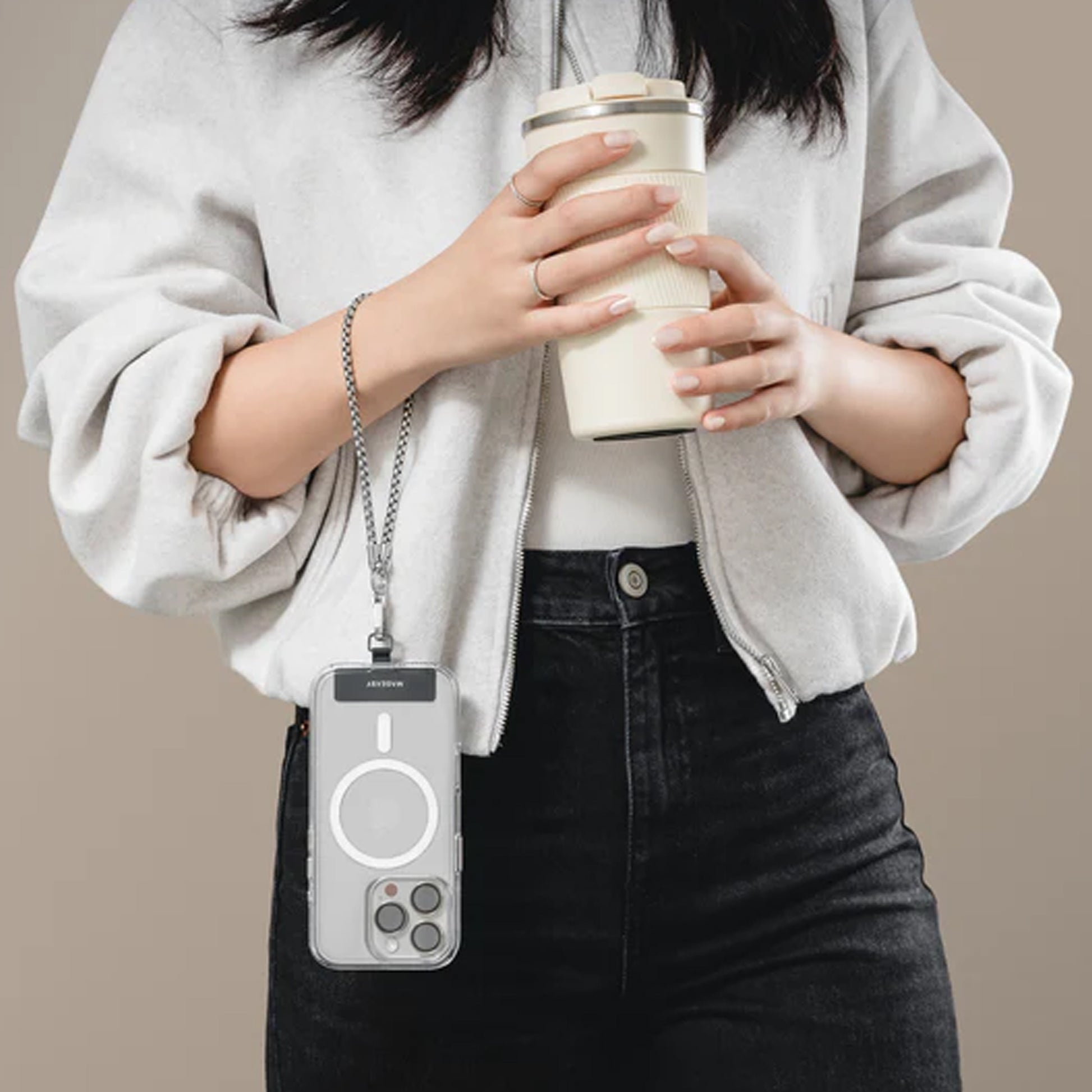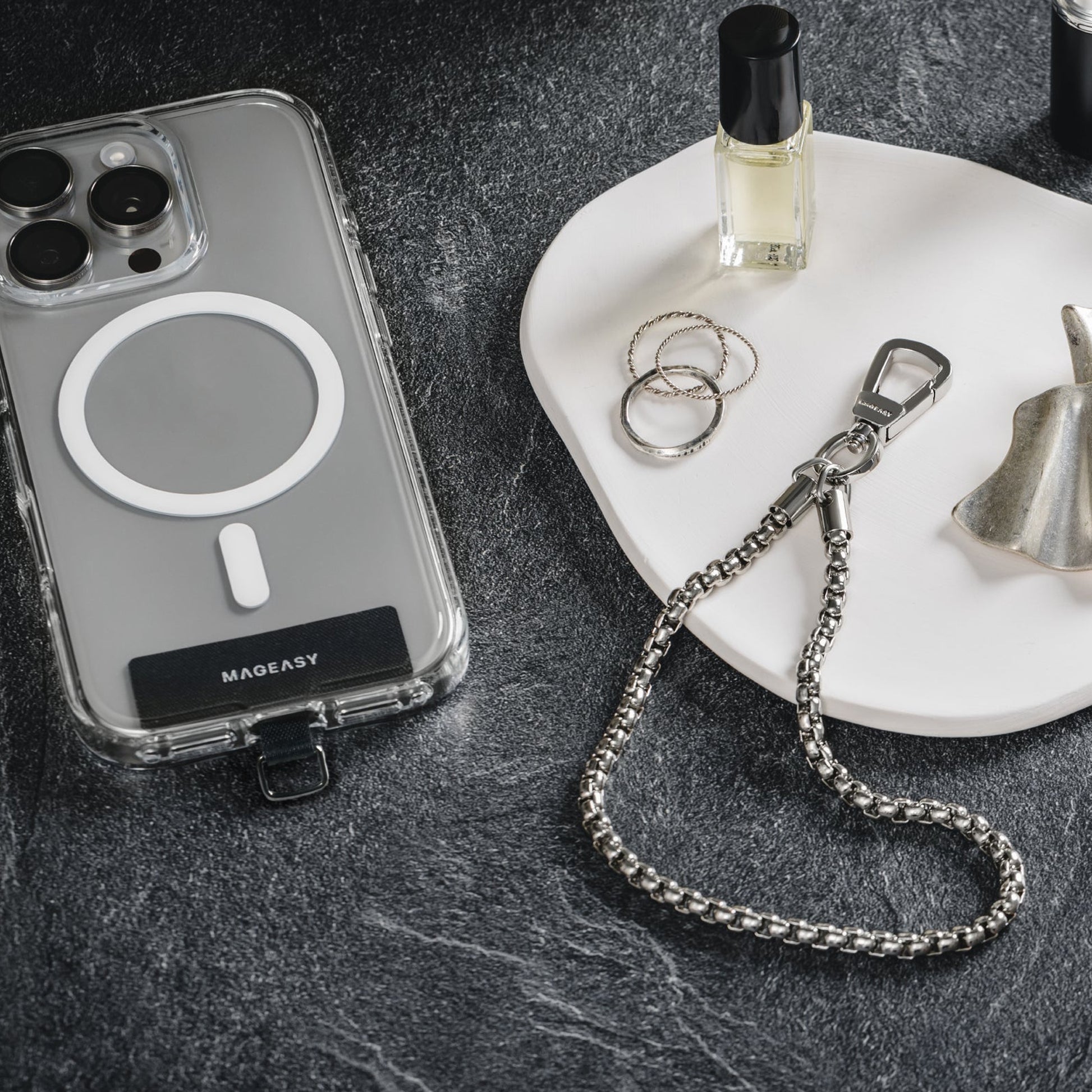 MAGEASY Metal Chain Wrist Strap 4.5mm + Strap Card Phone Lanyard. Combine elegance with practicality, effortlessly showcasing your personal style. The durable metal hoop is built to last, featuring a 360-degree rotating design for easy and convenient attachment. Crafted from hypoallergenic metal for ultimate comfort, the lightweight strap card fits seamlessly with most phone cases, ensuring style and functionality in one.